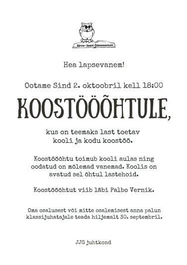 Kolmapäev, 2. oktoobril kell 18:00 toimub Järva-Jaani Gümnaasiumis koostööõhtu lastevanematega