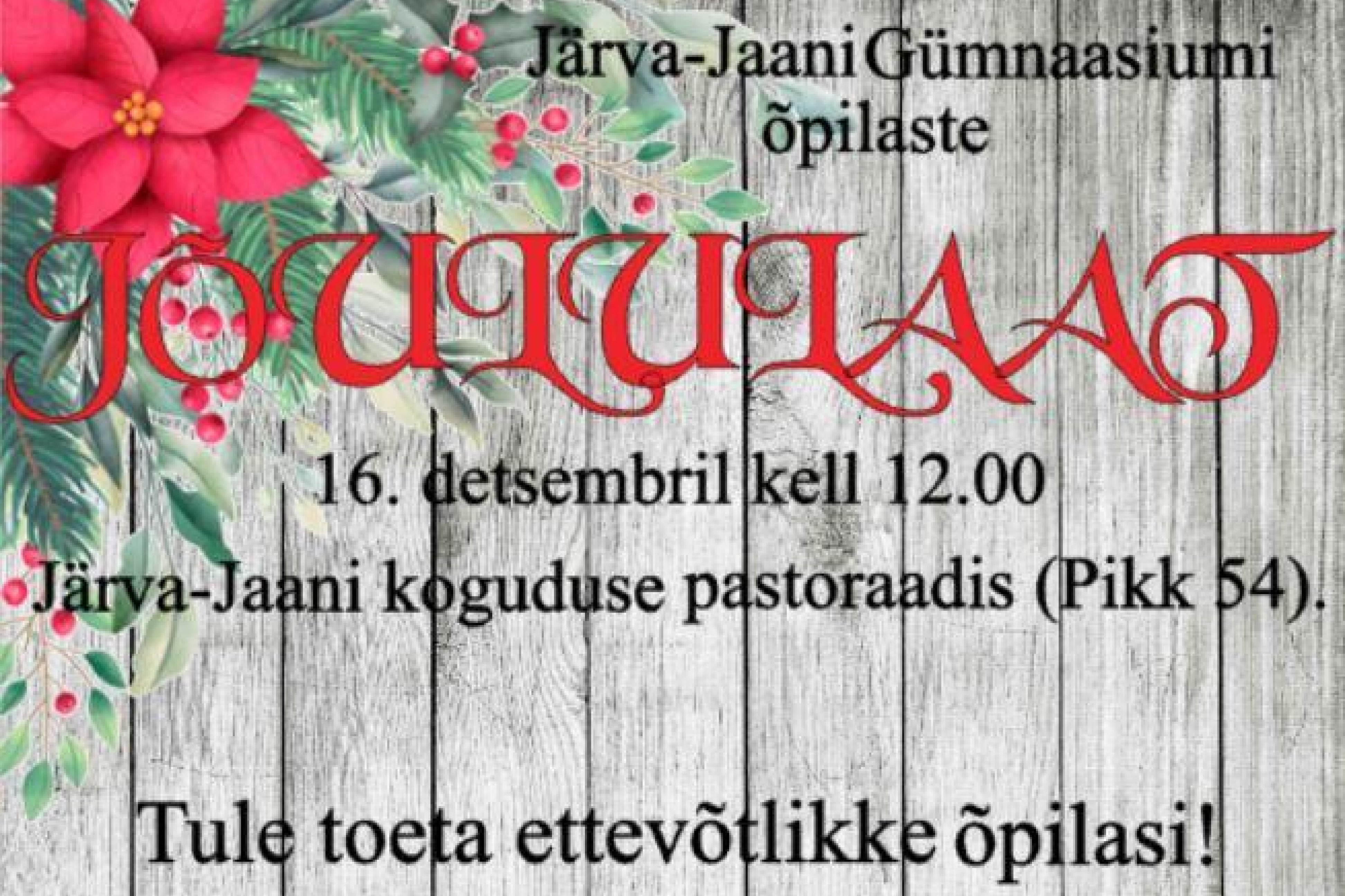 Järva-Jaani Gümnaasiumi õpilaste jõululaat toimub 16. detsembril 2019 Järva-Jaani koguduse pastoraadis (Pikk 54). Tule ja toeta ettevõtlikke õpilasi!