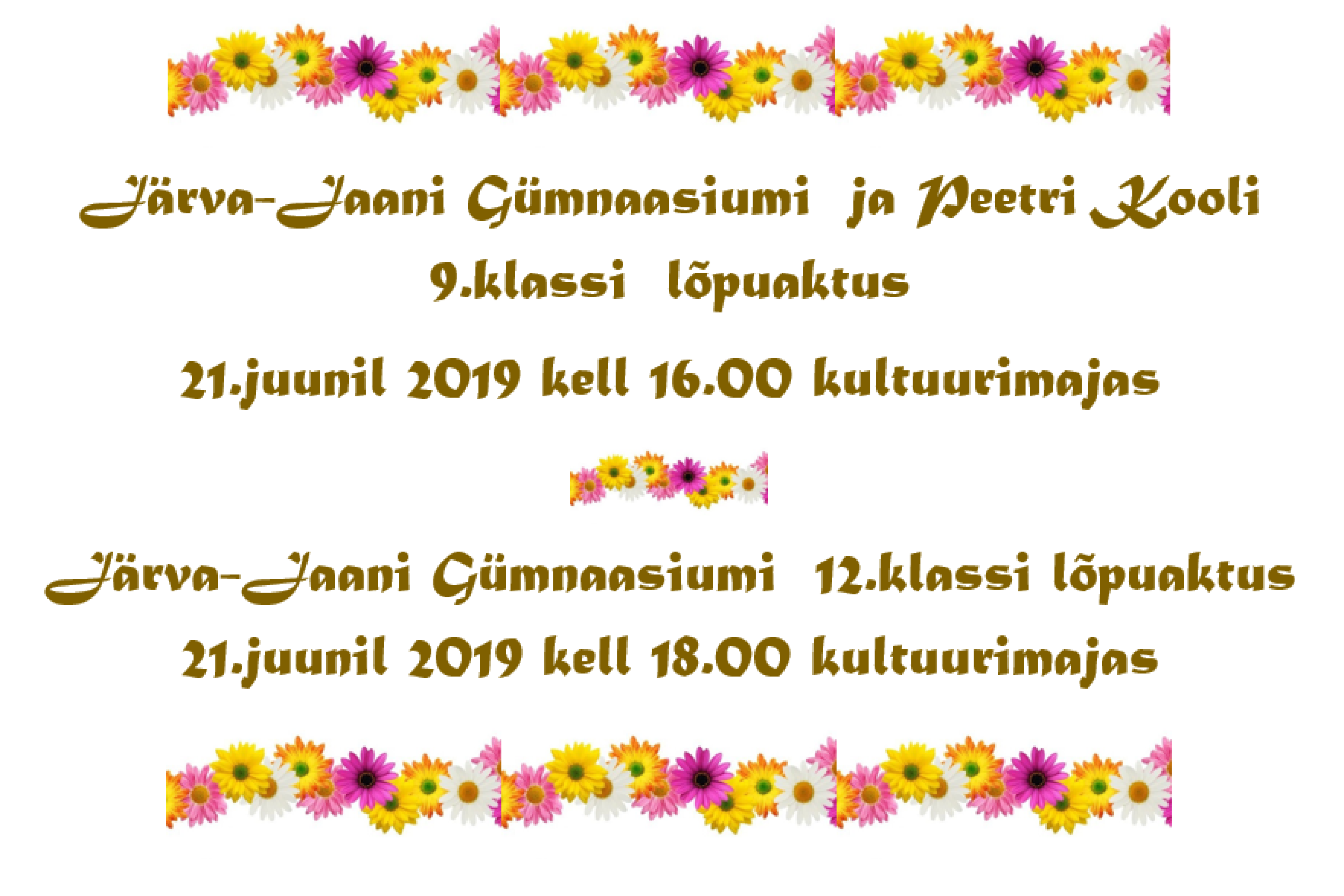 Järva-Jaani Gümnaasiumi ja Peetri Kooli 9. klassi lõpuaktus 21. juunil 2019 kell 16.00 kultuurimajas.