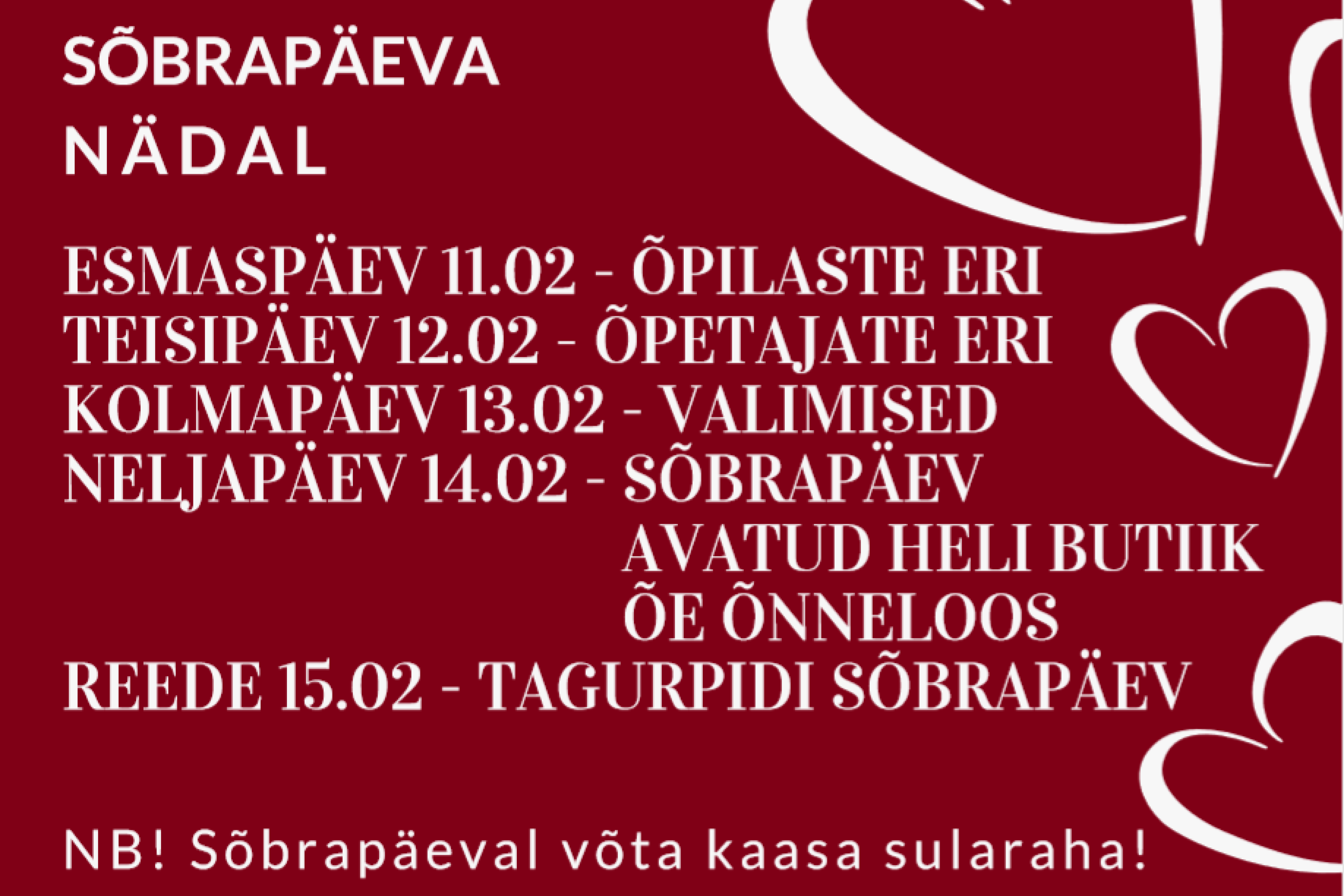 NELJAPÄEV 14.02 - SÕBRAPÄEV AVATUD HELI BUTIIK ÕE ÕNNELOOS