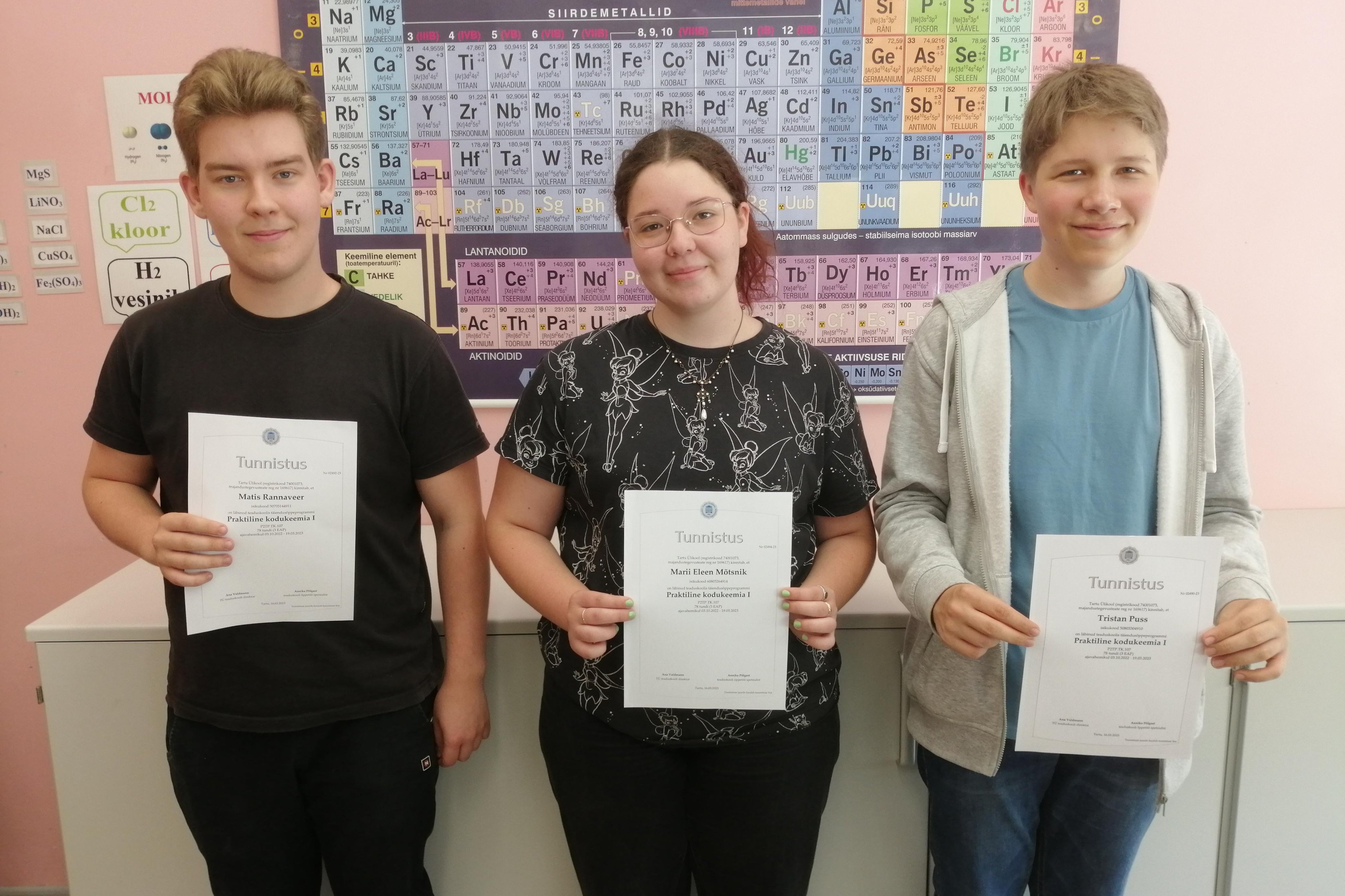 Marii Eleen, Tristan, Matis ja Martin läbisid Tartu Ülikooli teaduskooli 3 EAP mahuga e-kursuse „Praktiline kodukeemia I“. Kursus arendas eksperimentaalse töö läbiviimise ja saadud katsetulemustest järelduste tegemise oskust.
